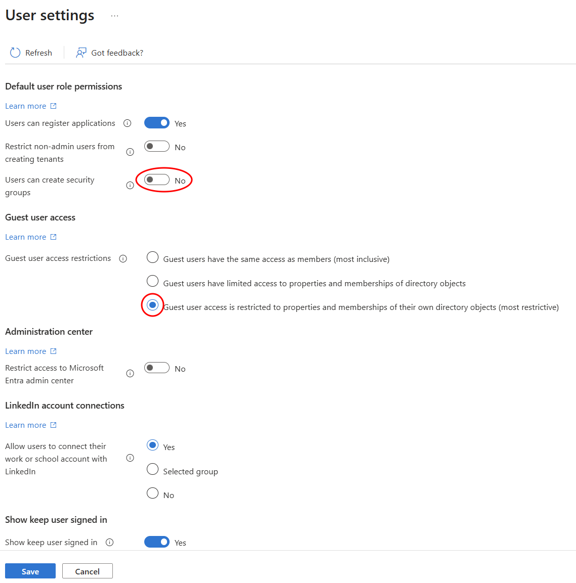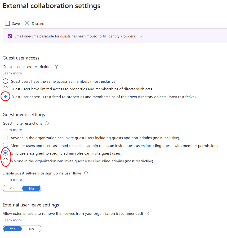 Bij de guest invite settings is het afhankelijk van de wensen van de organisatie. Standaard staat ingesteld dat iedereen binnen de organisatie gastuitnodigingen kan versturen. Dit is niet wenselijk. Beter is het dit te beperken naar specifieke beheerderrollen.