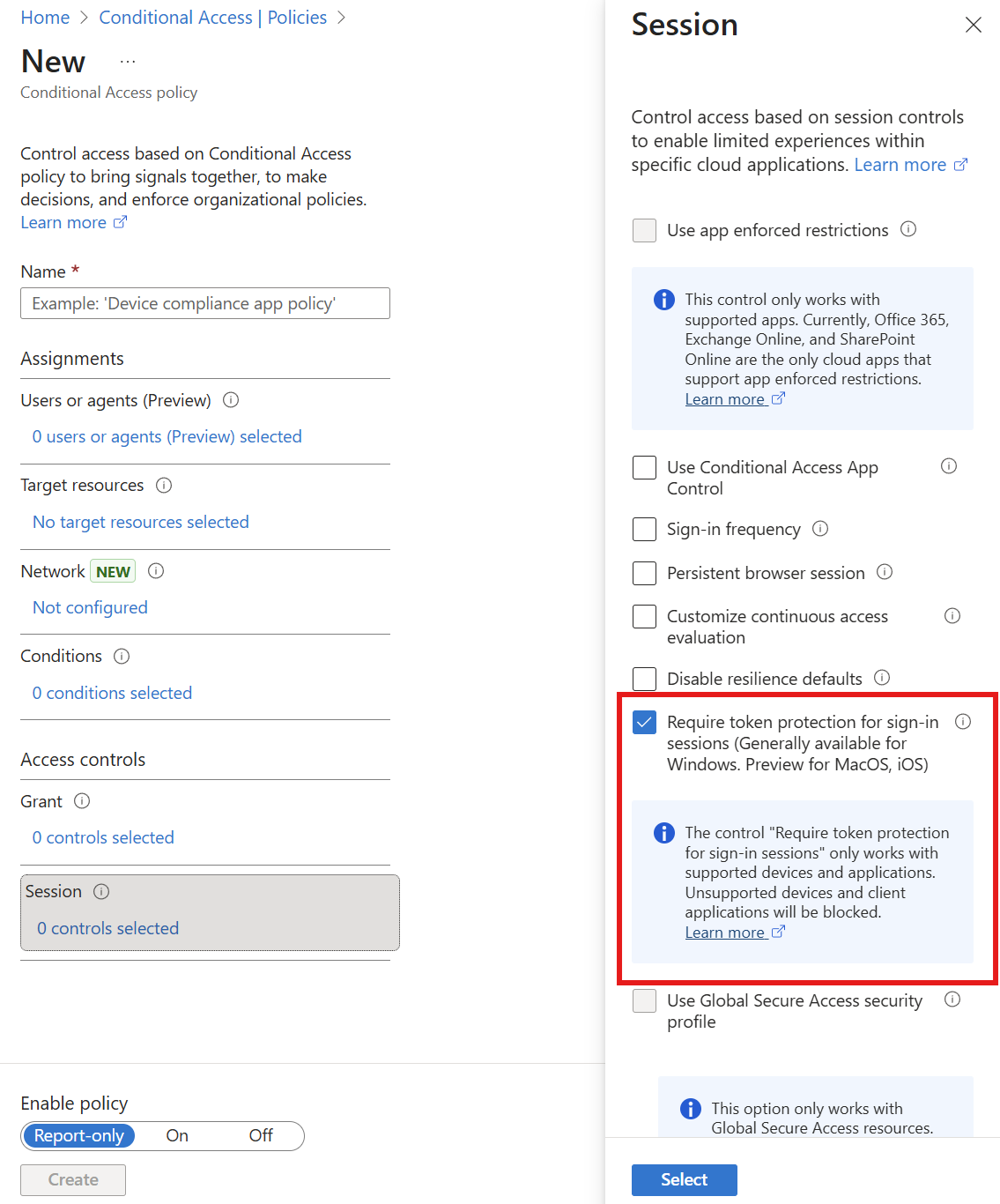 Je kunt hierbij token protection afdwingen. Wanneer een gebruiker een device registreert bij Microsoft Entra, dan wordt een Primary Refresh Token aan het device gekoppeld. Deze koppeling zorgt ervoor dat zelfs als een kwaadwillende actor een token steelt, deze niet vanaf een ander apparaat kan worden gebruikt. Om deze feature te kunnen gebruiken heb je een Microsoft Entra ID P1 licentie nodig.