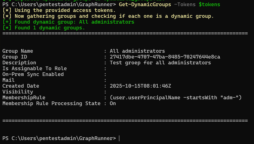 Nu hebben we inzicht in alle groepen, die beschikbaar zijn in de omgeving. We willen in dit geval echter weten of er gebruik gemaakt wordt van dynamische groepen, die we mogelijk zouden kunnen misbruiken.