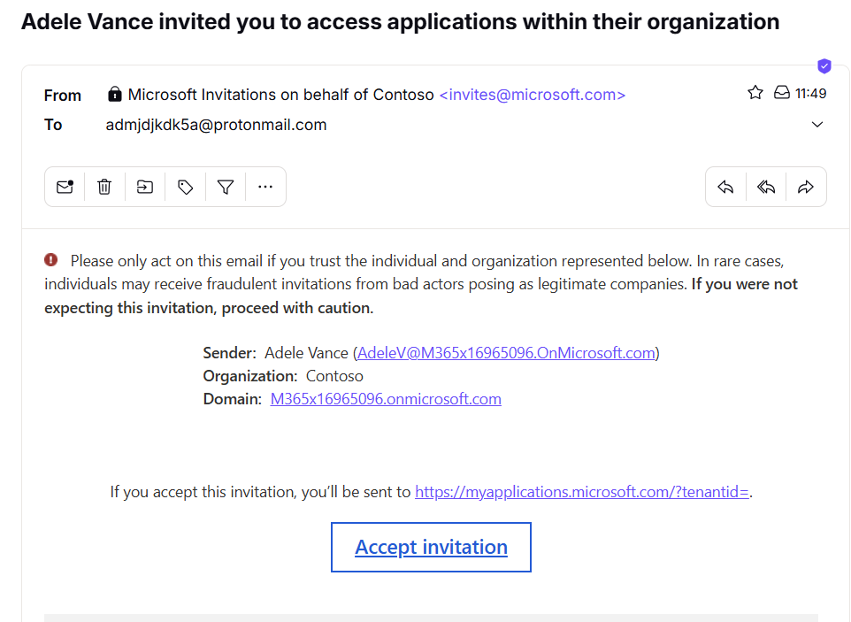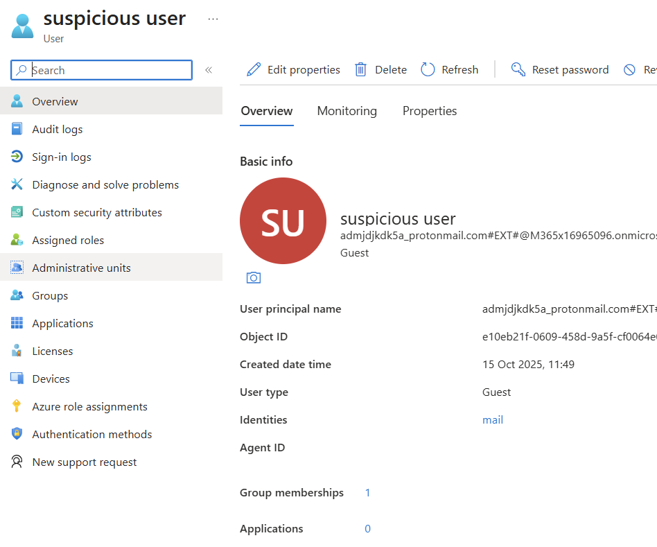 Vul bij het invite mail address het zojuist aangemaakte mailadres in. De display naam die je opgeeft is de naam zoals deze zichtbaar wordt binnen Entra ID. Ik kies in dit geval Suspicious user maar in praktijk zal je hier een minder opvallende display naam kiezen. Een redirect URI is niet nodig, laat deze leeg. Send an email invitation – true Je kunt nog een custom message body ingeven, maar dat is hier niet nodig en kan worden leeggelaten.