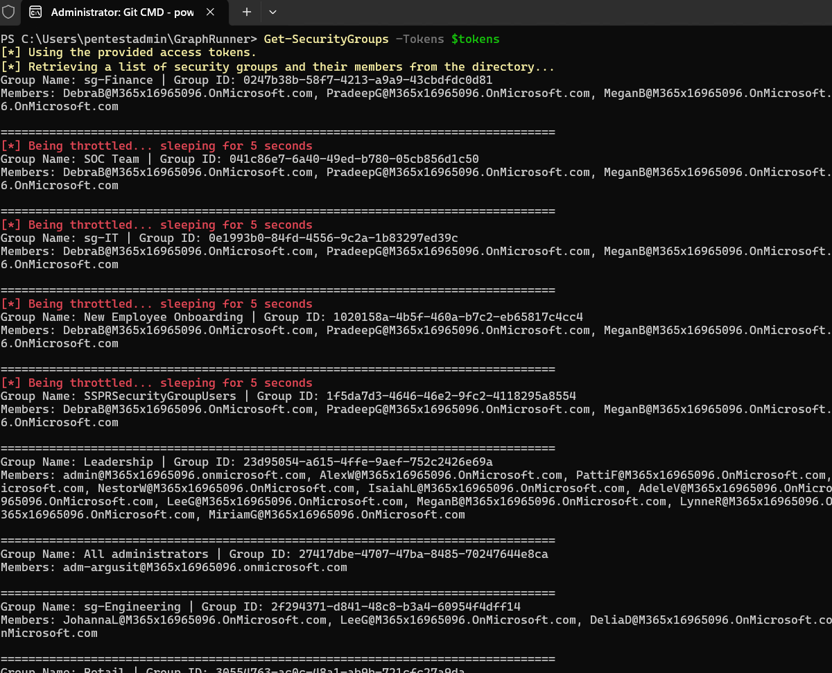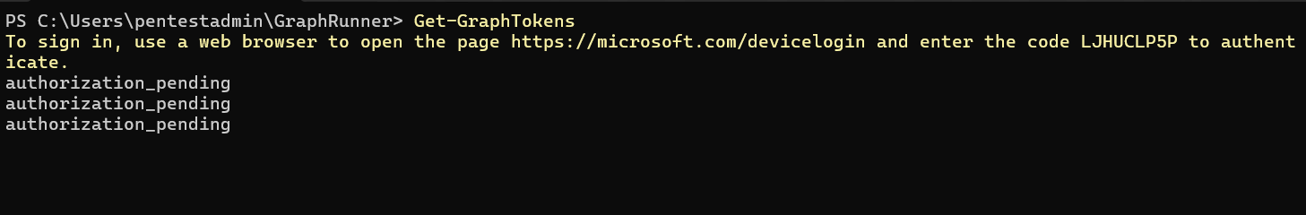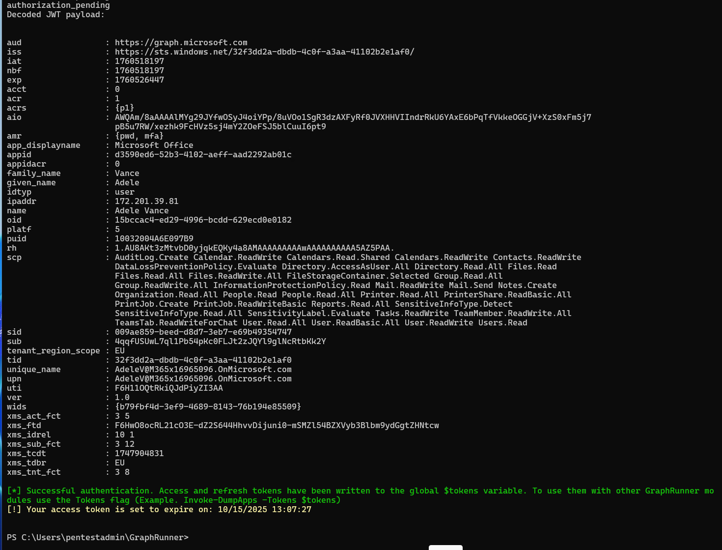 Direct nadat de gebruiker zich heeft aangemeld heeft de Graphrunner tool de access and refresh tokens weten te bemachtigen. Deze tokens kunnen vervolgens worden gebruikt om, als de betreffende gebruiker, aan te melden binnen de Microsoft omgeving.