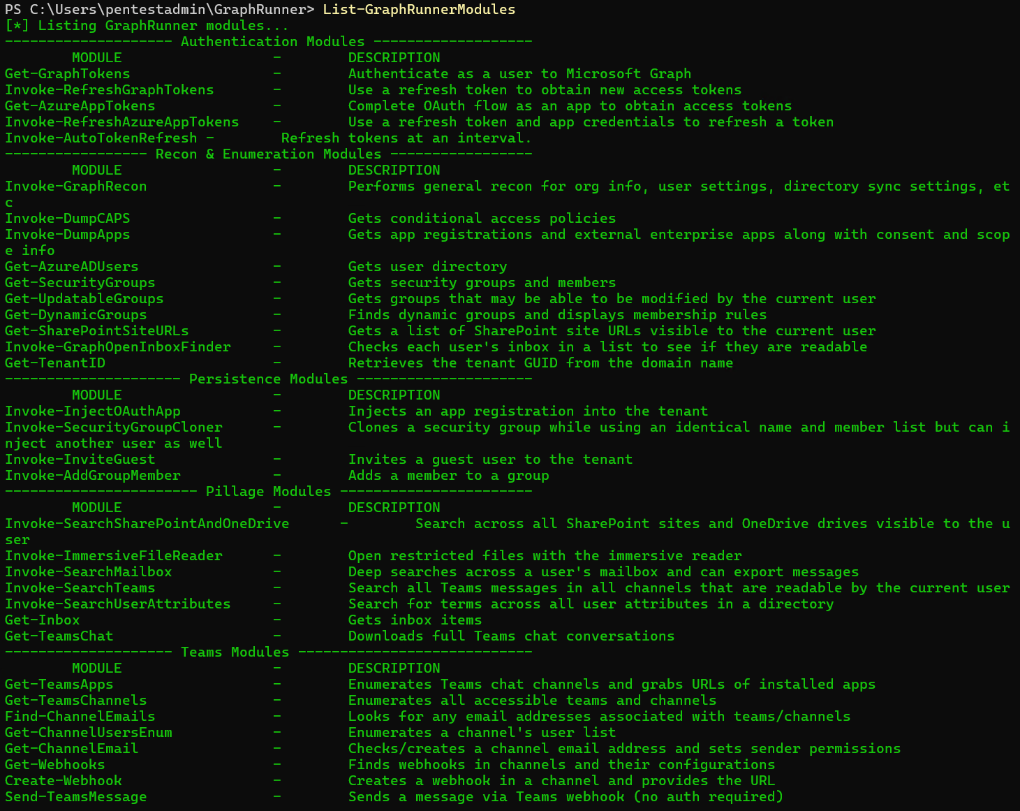 Als kwaadwillende willen we hierbij inzicht krijgen in het gebruik van groepen in deze Azure omgeving. In de lijst van modules van Graphrunner is hiervoor een commando: