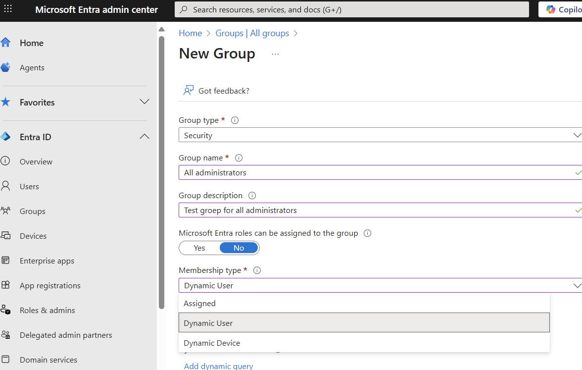Een dynamische groep kan worden aangemaakt vanuit de entra.microsoft.com portal. Kies Entra ID -> Groups -> All groups – New group