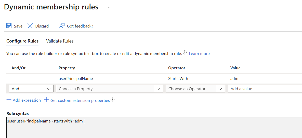 Door vervolgens op Add dynamic query te klikken kun je de regel(s) opgeven waaraan een useraccount moet voldoen om aan deze groep te worden toegevoegd.